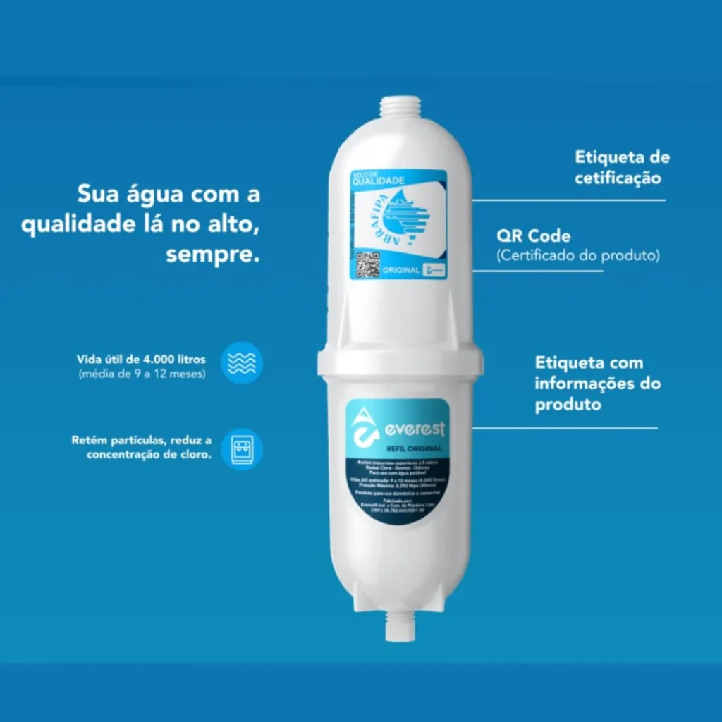 O Refil Original Everest foi desenvolvido para reter as impurezas contidas na água potável, reter partículas e reduzir a concentração de cloro.